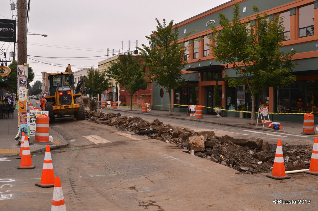 This summer work was done on Alberta St. Underneath the asphalt surface there was a layer of red brick and underneath the brick there were the tracks and ties to the old streetcar tracks that used to run along Alberta St. many decades ago. It was fun to watch the dig in progress, not knowing exactly what they would unearth. Some of the streetcar track was set aside for historical or artistic reasons.DSC_2589-001 DSC_2590-001 DSC_2592-001 DSC_2595-001 DSC_2596-001 DSC_2598-001