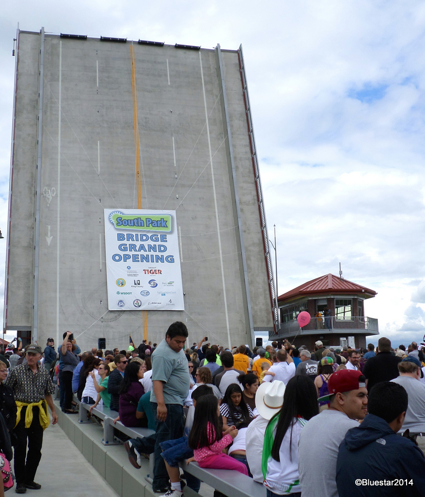 A couple of Sundays ago the new South Park Bridge celebrated its opening. Ceremonies included fire works, parade (photos to follow) and the usual dignitaries. I had been following the project since it started in 2011 and even before. Some of my ‘before’ photos can be seen here, on the King County website. John Stamets, the official photographer for the bridge project, passed away suddenly two weeks before the opening ceremony. Follow his chronicle of the bridge project here. I was fortunate to attend some of the community meetings where John’s Powerpoints were presented. He was great fun to listen to and learn from. He led a rather extraordinary life and I think there is a link to his bio on the page I just linked to. Although the bridge closure and replacement was difficult on the residents and businesses of South Park, I think the people in charge of making it happen and working with the community did an outstanding job. Tim, the chief engineer on site every day, kept his cool and sense of humor throughout all of the setbacks and community frustrations. Ashley DeForest and DeAnna Martin, as Community Relations Managers, were great in dealing with the community and keeping everyone informed. I think the project was lucky to have these individuals working together, along with John Stamets. Tim, the chief engineer, decided to make this his last project and he has or is in the process of retiring. Not many new bridges get built, so I think he felt this was a great way to go out.