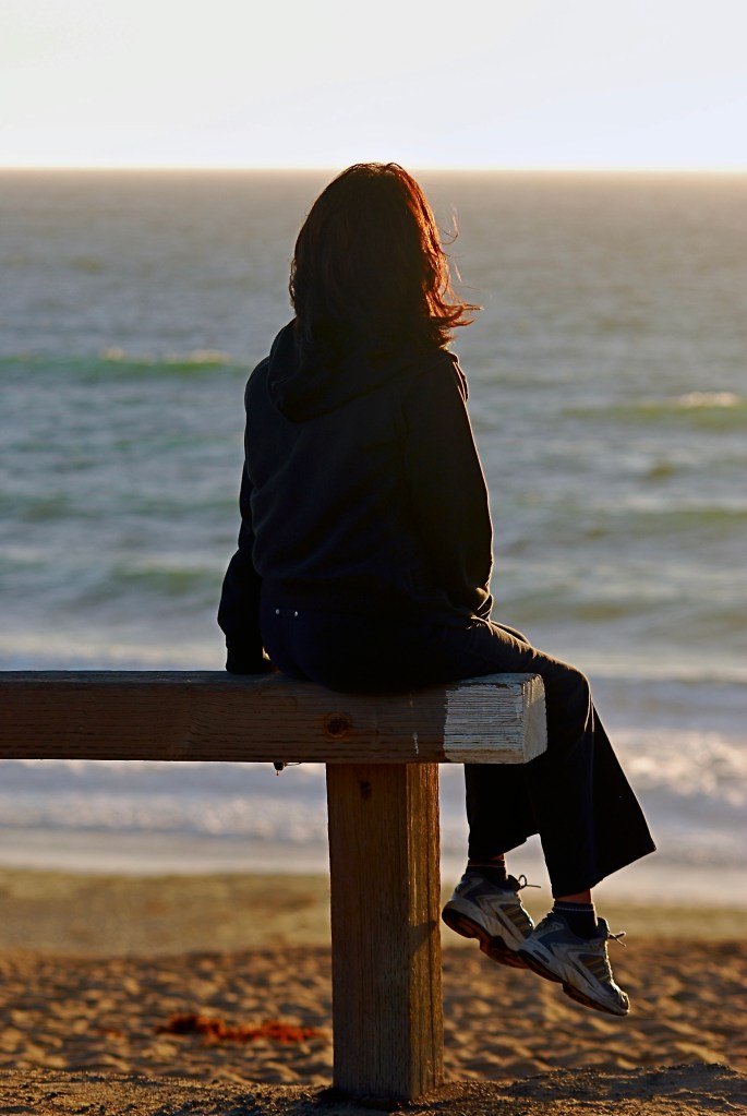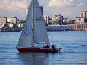 Pinkish-lavendar sky with the moon hanging about. Photo taken with an Olympus point and shoot camera 6 years ago. Note the peace symbol on the sail. I was attending a peace rally at Alki Point and this sailboat came by, to the cheers of everyone on shore.