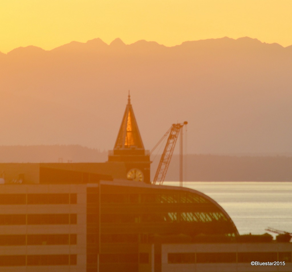 The clock tower of King St. Train Station. Shot at dusk, looking East, from the 12th Ave. Bridge. This bridge links Beacon Hill and the International District in Seattle. Olympic Mountains in the background.