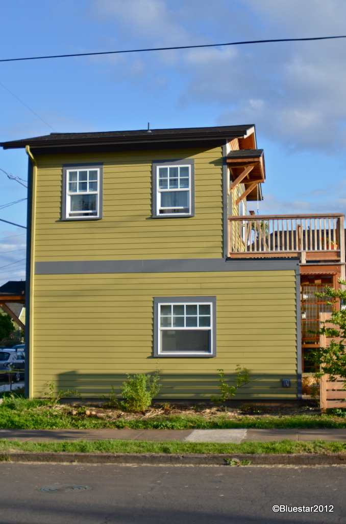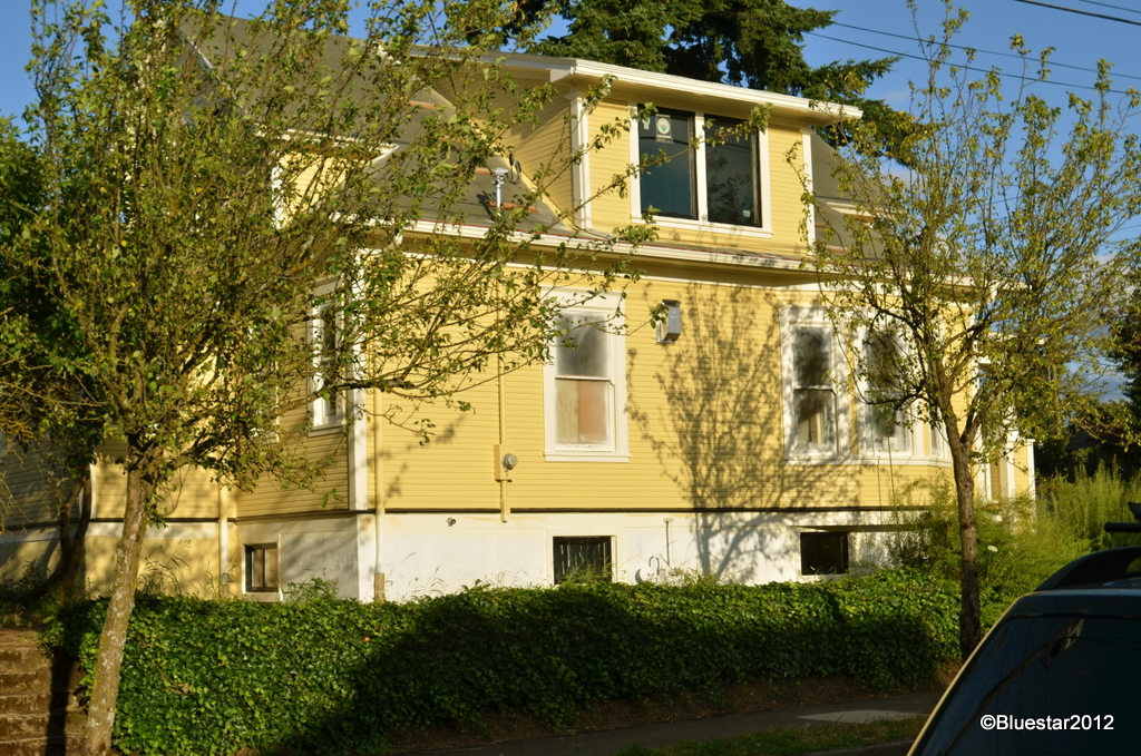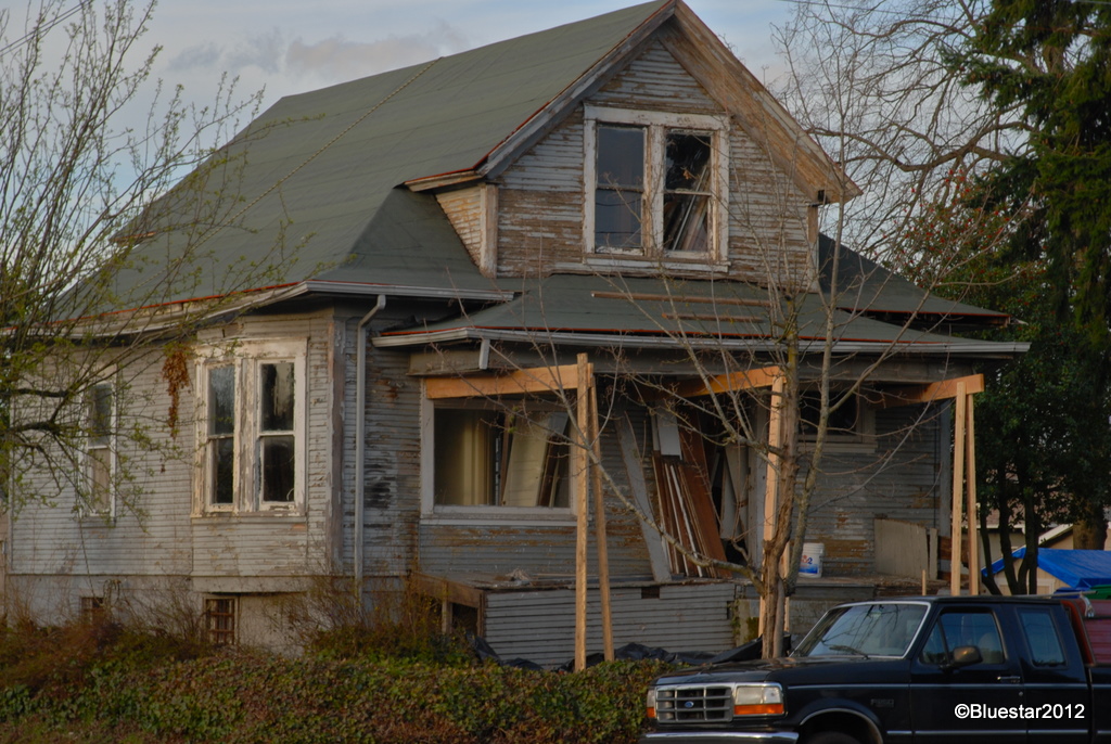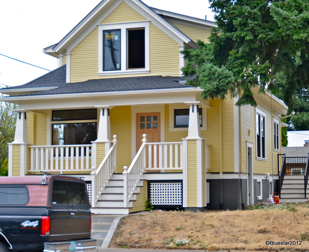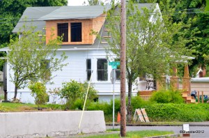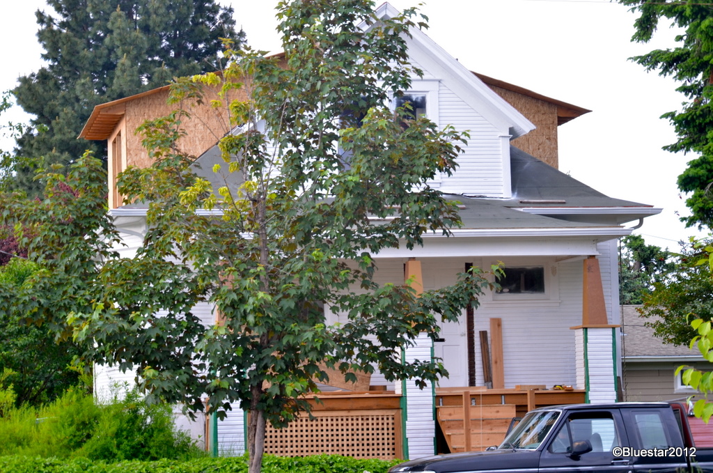 It has been a while since I posted something about Mike’s house in NE Portland. Since the last posting he has punched out some dormers upstairs, painted ( probably primer) the outside and removed the old front & back porches. I haven’t been inside the house, but my guess is that it is mostly gutted. The dormers are a good way to increase usable square footage and not really add much to the cost of renovating.