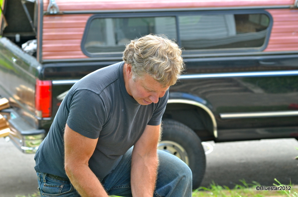 Mike hard at work ( until I stopped by to talk ). The house now has a new porch and columns, dormers upstairs, new furnace, plumbing. Mike said he is about four months from completion and is a little over budget. The wiring needs to be replaced, new windows as well as new sheetrock for the interior ( original was plaster and lath ). Mike let me in the basement to take a look at how it will work, with refinished cement floors, rooms for entertainment, etc. I think he said he hauled out 3 3 yard dumpsters of debris, etc from the basement alone. Things are really moving along, though. It has been fun to follow this major rebuild from the begining.