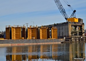 Duwamish River at 14th St. Bridge. These pilings, I believe, were put in place to guide the large ships through the narrow passage of the drawbridge. Right now construction of the new bridge is progressing. They are building the cofferdams for the new bridge using the large crane seen in a previous post.