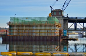 Recent photos of the construction of the new 14th St. ( Duwamish River ) Bridge. Top Photo: view of East Span with new cofferdam behind the barge. Middle Photo: view of the new cofferdam on West side of span. Bottom Photo: view of original East Span. The interesting thing in this view is the eight vertical I-beams that had to be installed on the old section in order to hold the weight of the crane parked on top. The bridge could not hold the load of a crane that was needed to build the new bridge. Driving the 8 beams into the river bottom to add strength was a cool, engineering idea.