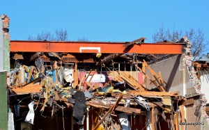 The place where the back hoe is parked used to be a white house where a lawyer’s offices were located for many years. The image of the wreckage of a commercial building is what used to be Bank of America, on Broadway. From what I understand they had a lot of trouble destroying the vault, which is comforting. I think many people will think this is a fitting end to a Bank of America facility.