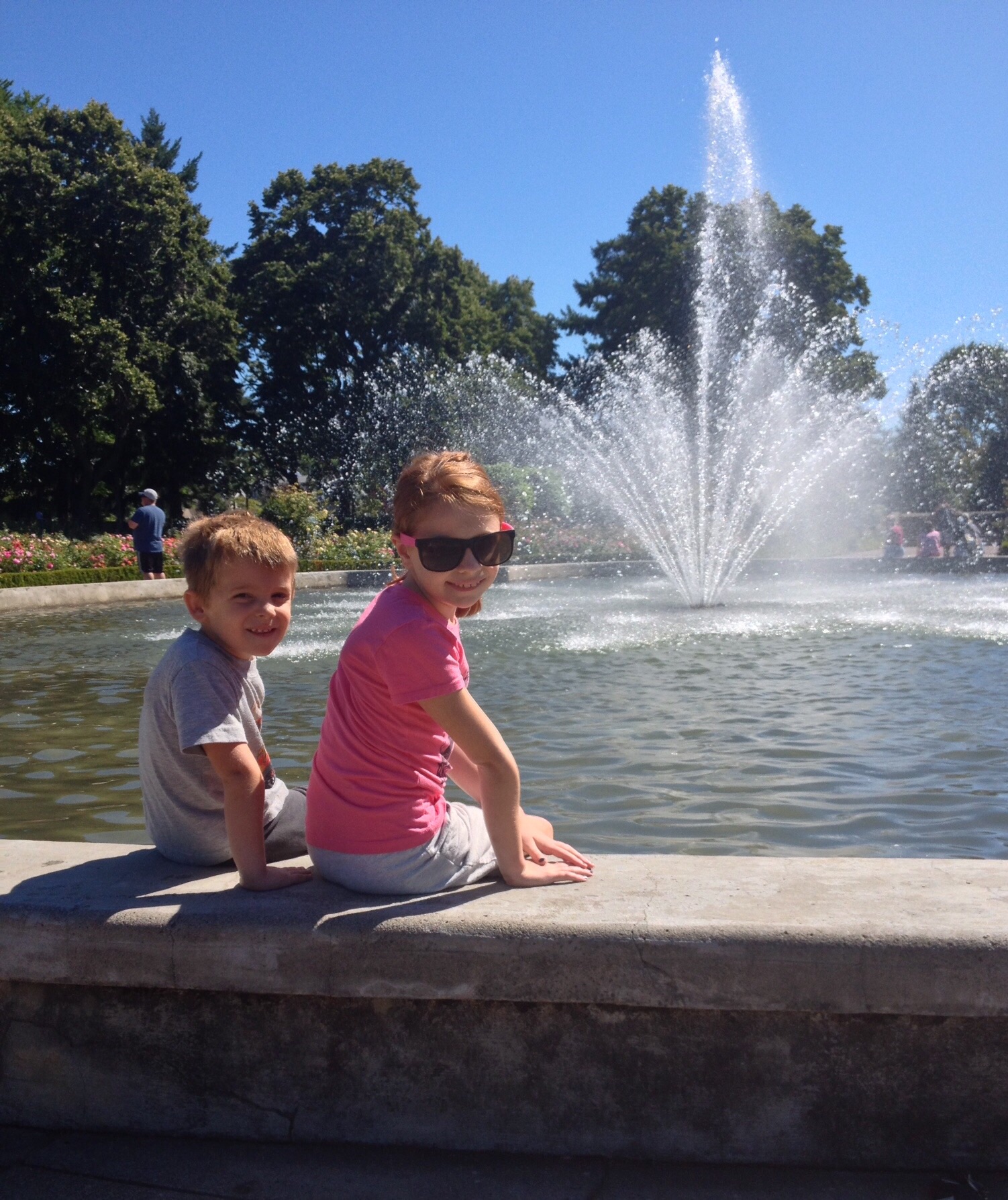 At Portland’s original Rose Garden and Fountain, two of our grandchildren. Before moving to a larger plot of land, just west of downtown Portland, OR., the original Rose Garden was located in NE Portland, where this photo was taken. Dipping your feet in the fountain pool is a good idea when the temps have been hovering around 100!