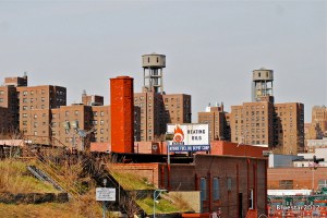 A view from Gowanus Canal area of Brooklyn looking north towards a dense, urban area.