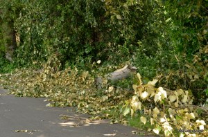 Views of cyclists, tree limbs broken from high winds and apartment complex perched precariously on a hillside above a gravel pit were seen this day along the GR Trail.