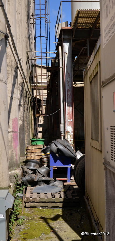 Two views from behind the main complex of buildings that was the Fisher Flour Mill. The ‘mud’ puddle was more than just water and dirt. The green, slimey stuff gave off a really nasty odor, very reminiscent of the Gowanus Canal smell I have experienced. Like death, it is a very unique smell that you never forget.