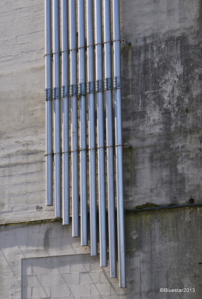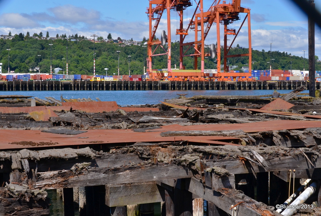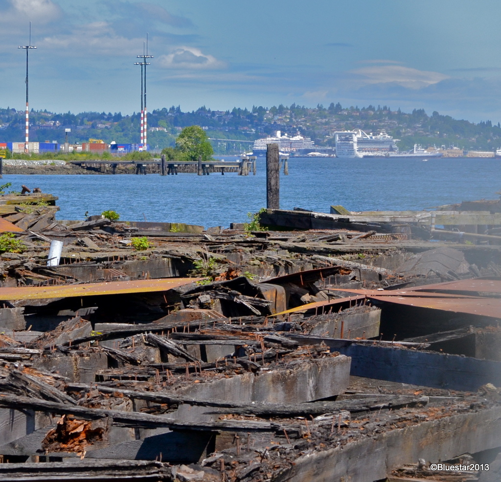 Electrical conduit to nowhere and a crumbling pier-shot through a cyclone fence. Two of the cruise ships that travel from Seattle to Alaska every summer are in the background.