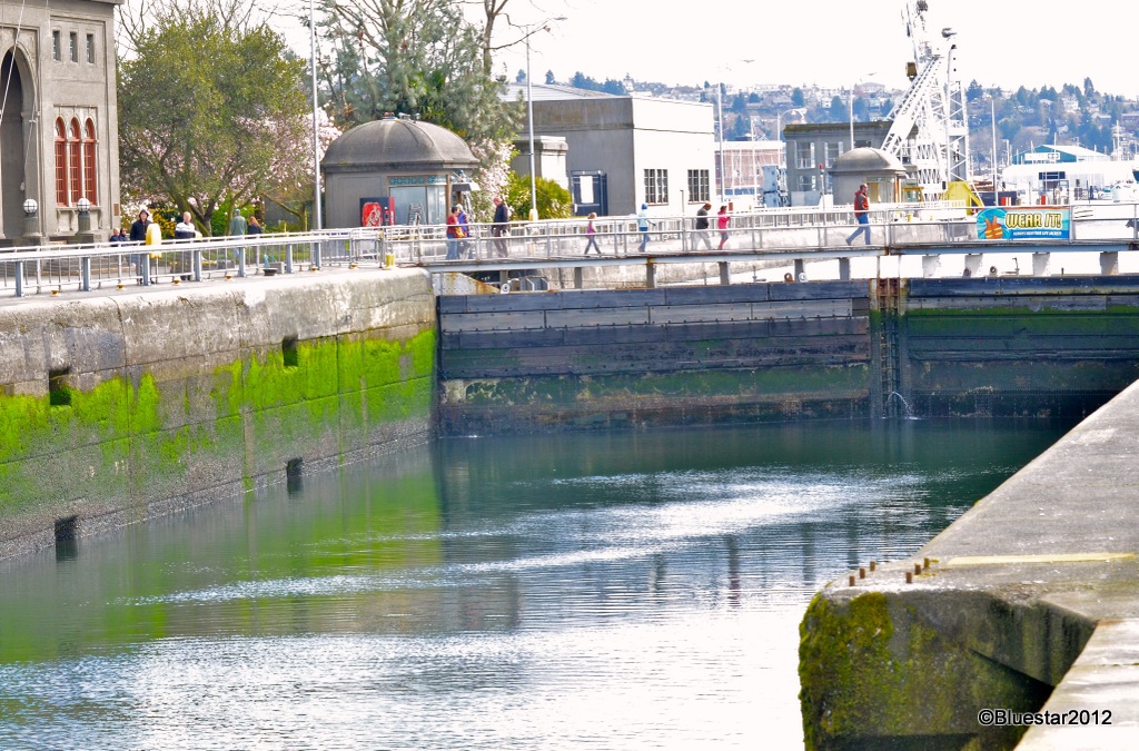 Large gates closing. Second photo the gates are closed. Third photo is one of the hydraulic hinges ( really not sure what the technical term is ). Once the gates are closed the water level is either lowered or raised depending on which direction the boats are going. This is the northern lock that allows boats to move from Lake Washington out to Puget Sound. The water level has to be lowered because the water level of the lake is higher than that of Puget Sound.