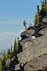Photos were taken from the Sunrise side of Mt. Rainier. The lodge is at @ 6400′ elevation. Trails that lead up to the glaciers, alpine lakes and other ridges start from this lodge. This day we took a short trail called Huckleberry, steep, but short. The outcropping of rock is fascinating. There are spots along the trail, viewpoints I guess, where the drop-off is a direct fall for hundreds of feet. I have a thing about heights so I stay back from the edge at those points along the trail.