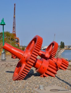 Views of the large gears located at the Portland St. Park on the Duwamish River, in the South Park neighborhood of Seattle.