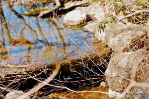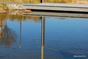 A section of blue sky reflected in the river. The mood along the river seemed to change suddenly. A partially cloudy morning turned into a steel-gray morning with the wind causing ripples on a calm river. Despite a few garbage cans close by trash seems to accumulate. To me the cement blocks are more of a reminder of an earlier time when pollution of every sort could be found in and around the Duwamish River.