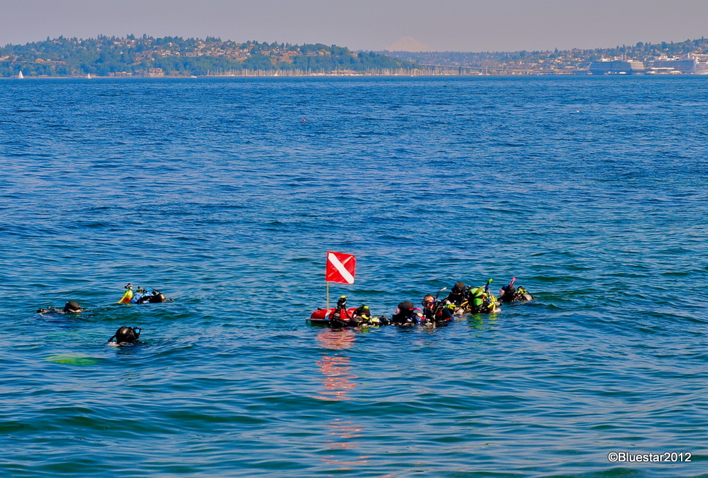 Diving class just off shore on Alki Dr. in West Seattle. Saturday mornings there are usually a group of divers at this location or on the other side of the point, two miles from this spot. If you click to enlarge the image you can see Mt. Baker in the center background.