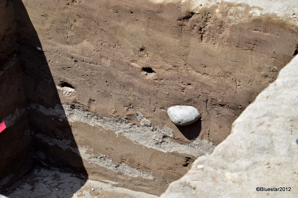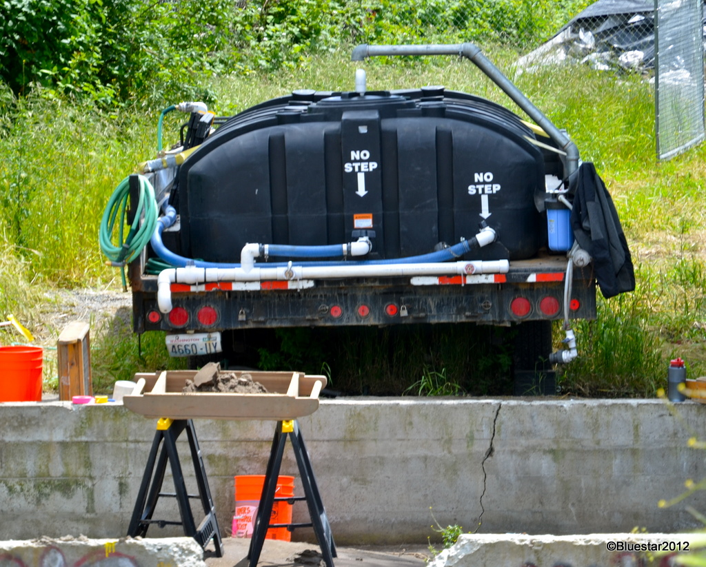 Before the actual construction starts on the new bridge an archeological survey of the site must be done. A few dig spots, like this one, are being looked at. You can see the different strata of the soil. Once the survey is done the SDOT website will post data, images and a video of the survey. More information than I can comprehend, although there are some interesting things being found. There were no permanent villages or settlements in this location of the current river and bridge, just seasonal fishing camps. The black tank holds water they use for sluicing the material as needed.