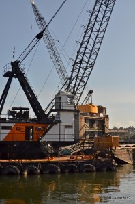 The large crane at the site of the South Park Bridge. There are three cranes at the site at this time. This large one sits on a very large barge. Even with a wide angle lens I couldn’t get all of the barge in one shot. The yellow crane up on the old bridge in the background will give you a sense of scale.