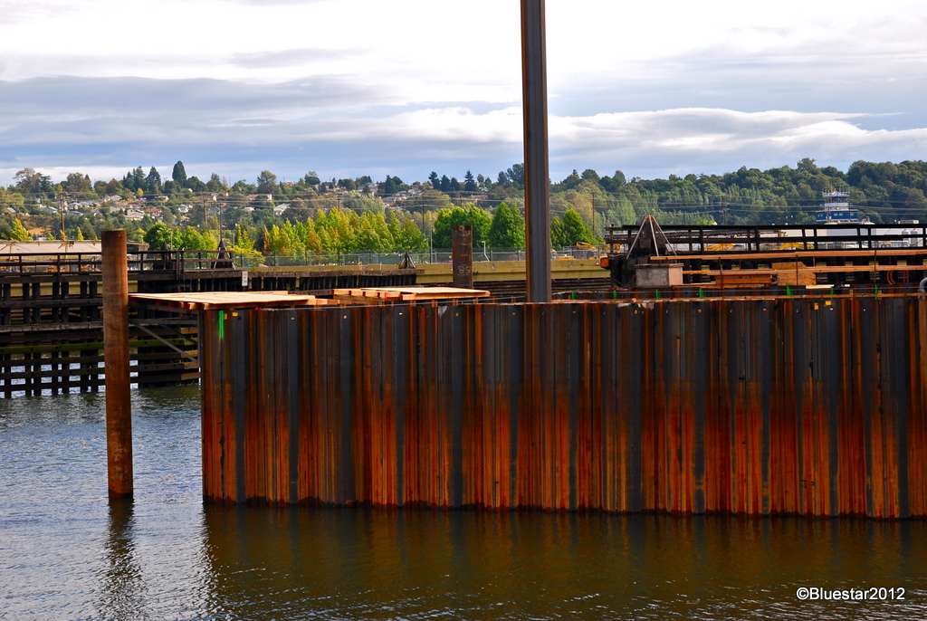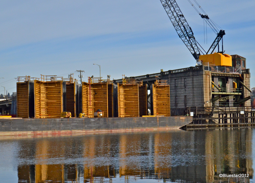 Recent photos of the construction of the new 14th St. ( Duwamish River ) Bridge. Top Photo: view of East Span with new cofferdam behind the barge. Middle Photo: view of the new cofferdam on West side of span. Bottom Photo: view of original East Span. The interesting thing in this view is the eight vertical I-beams that had to be installed on the old section in order to hold the weight of the crane parked on top. The bridge could not hold the load of a crane that was needed to build the new bridge. Driving the 8 beams into the river bottom to add strength was a cool, engineering idea.