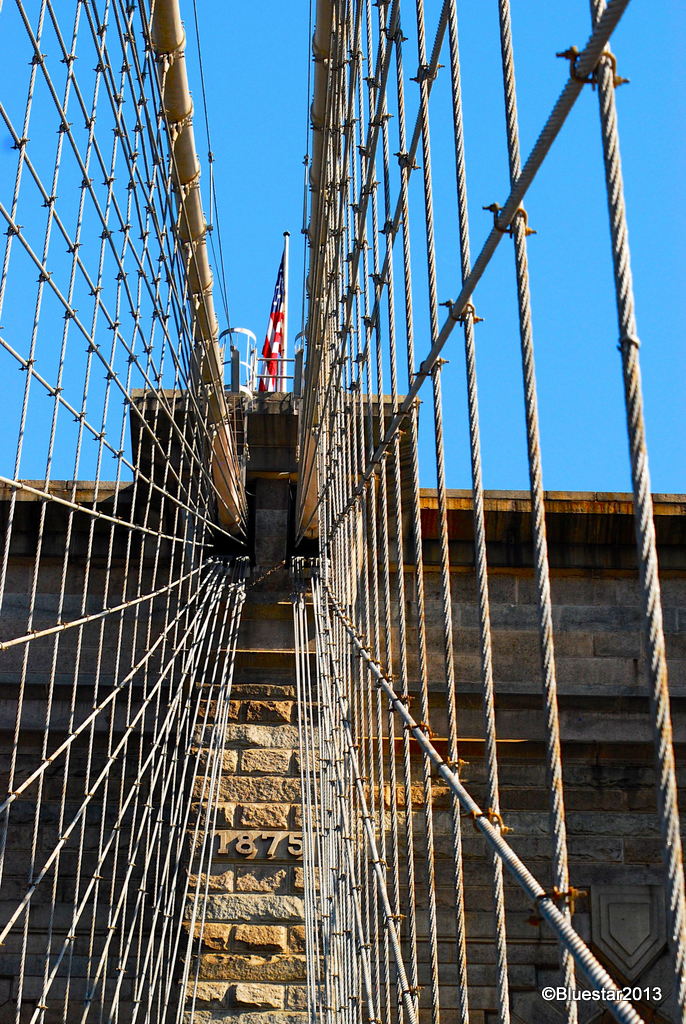 The flag atop the Brooklyn Bridge. If you look closely you can see the year, 1875, between the cables on the stone column. The vanishing point is a little left of center but, what the heck, so am I.DSC_0325